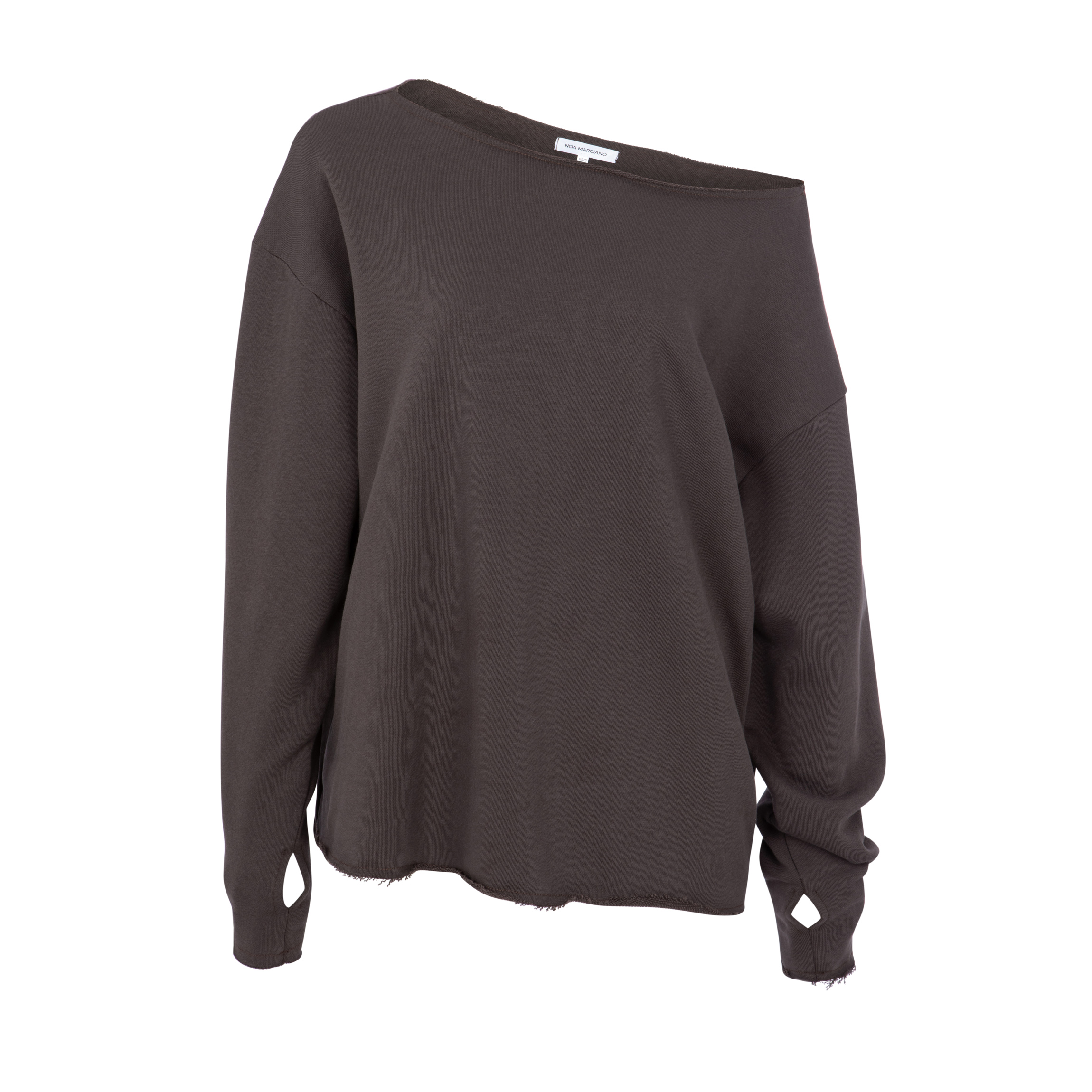 חולצת טי שירט מבד פרנץ טרי עם מחשוף גדול לחשיפת הכתף וסיומת גזורה