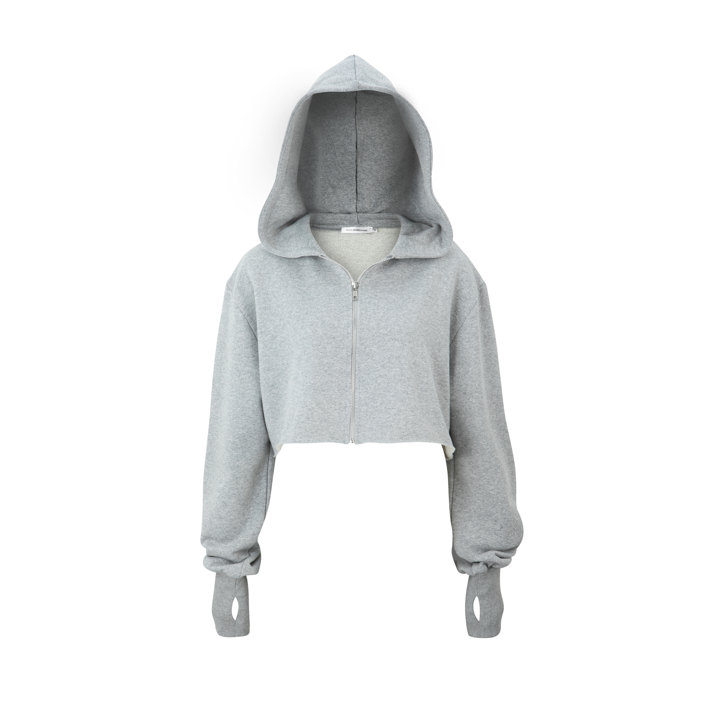 סוויטשירט עם קפוצ'ון מבד פרנץ טרי עם רוכסן וסיומת גזורה בגזרת קרופ.