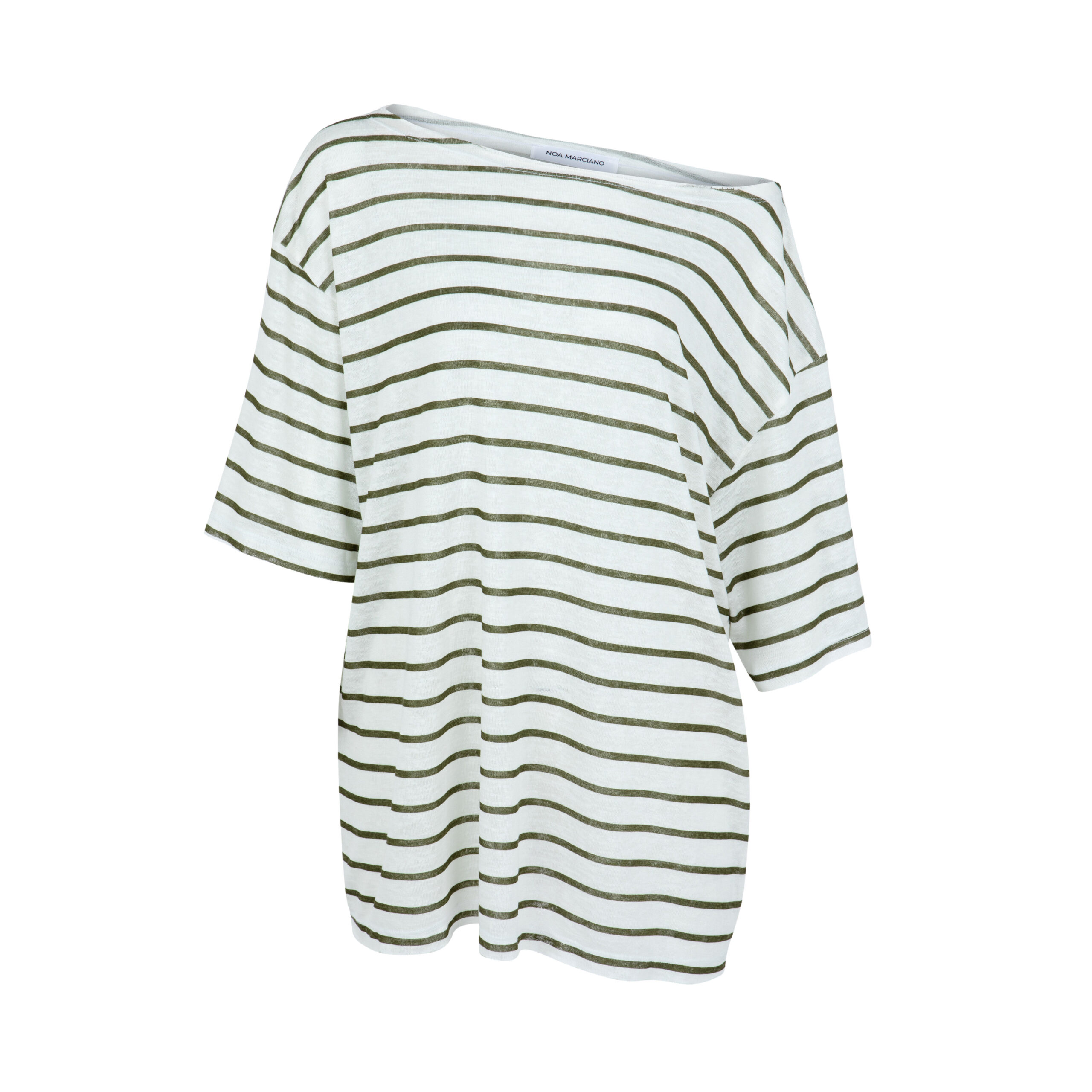 חולצת טי שירט מבד דק וקליל עם מחשוף גדול לחשיפת הכתף וסיומת גזורה